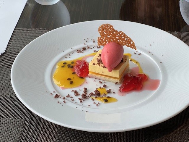 (キャプ)お楽しみのデザートは「マンゴームース ハイビスカスとライムのジュレ」。夏感たっぷりの爽やかな味わいで、お口もサッパリ!