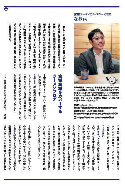 常に新しいトレンドが生まれ、進化し続けるラーメン業界。その動きを追いかけ、食べ歩く2人のラーメンラバーに「宮城のラーメン」について愛情たっぷりに語っていただきました。今回は気になる内容をチラ見せ!