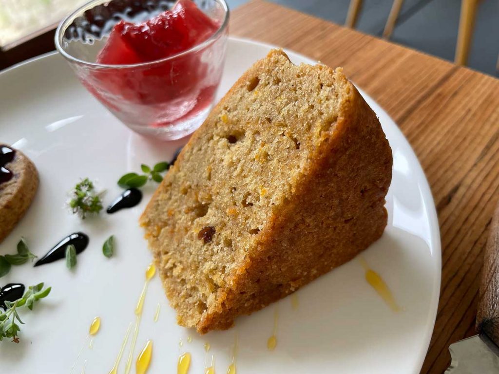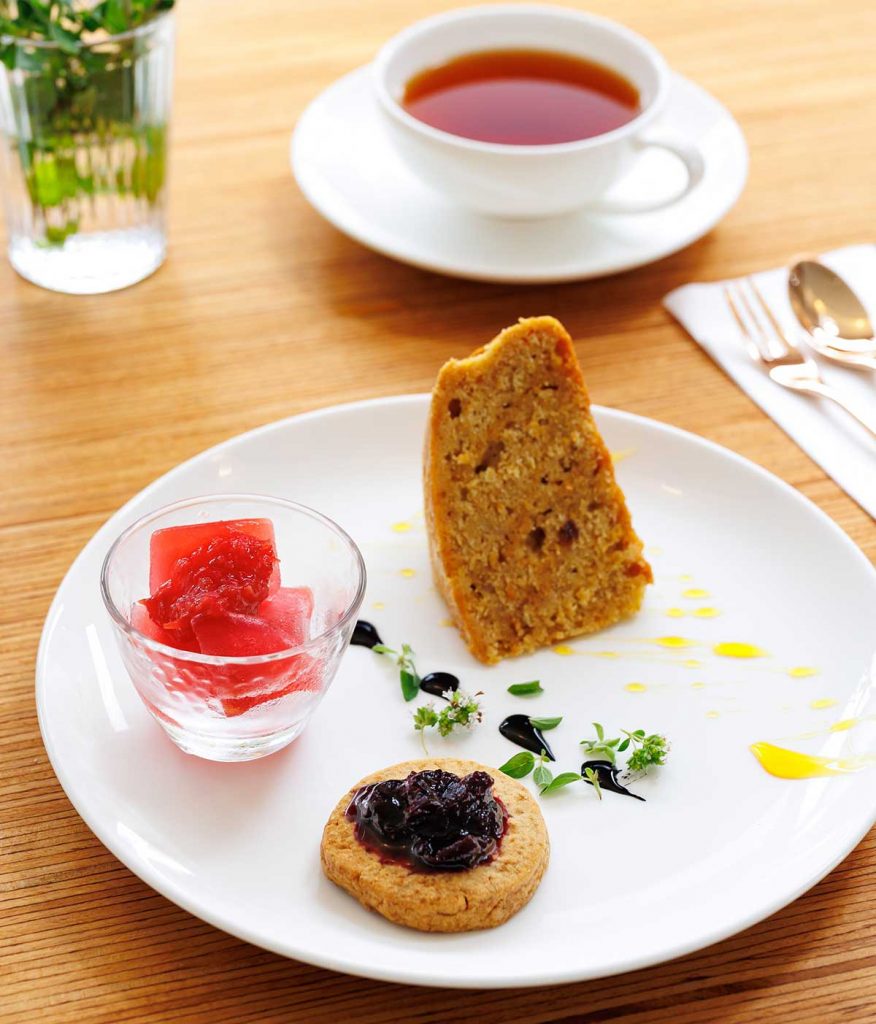 週替りの「デザートプレートセット」もいただきましたよ。編集部おげんは2種類あるデザートメニューから、「スイーツアラカルト」をセレクトしました。オーガニック素材にこだわったデザートは身体にやさしいおいしさ。彩りも華やかで、写真に収めたくなるひと品です。