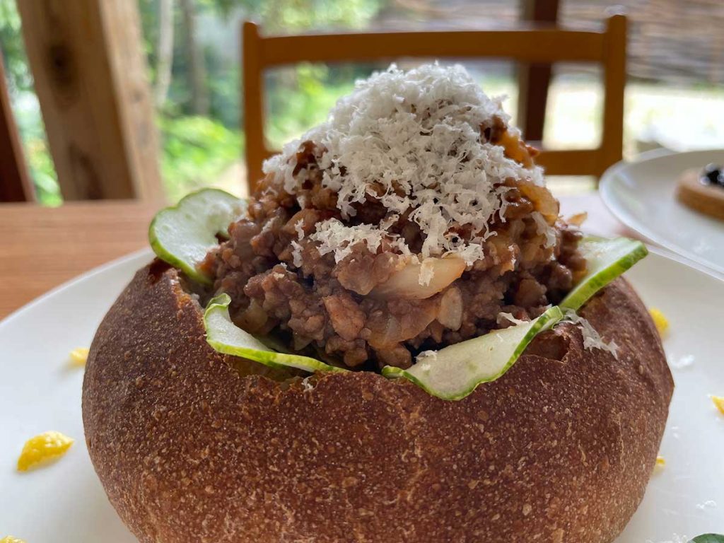 食べ応えのあるハード系パンの表面を程よく焦がし、ライ麦の風味を高めたこちらのひと品。上には豚と牛の合い挽き肉、キャベツ、たまねぎ、じゃがいもなどで作るミートソースにスライスしたきゅうり、最後の仕上げでパルミジャーノ・レッジャーノを散らしています。