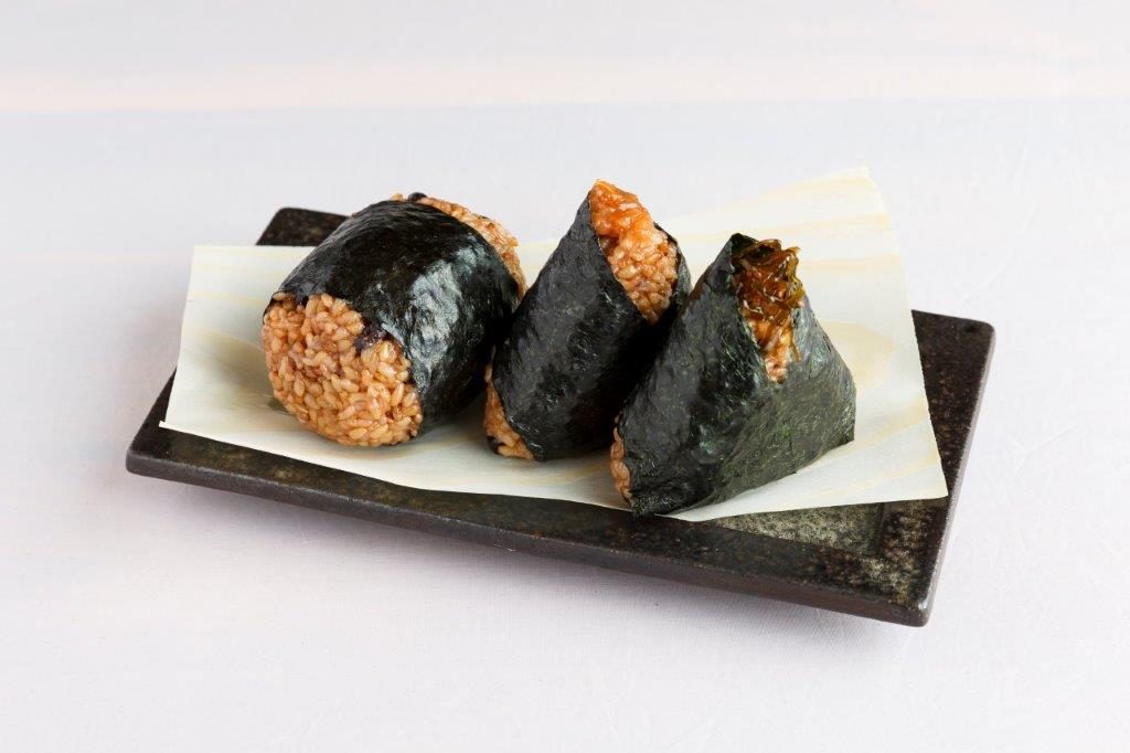 (写真左から)味玉、うめ、えごま昆布味。「寝かせ玄米お結びセット」(790円)はこの中から2種をチョイス