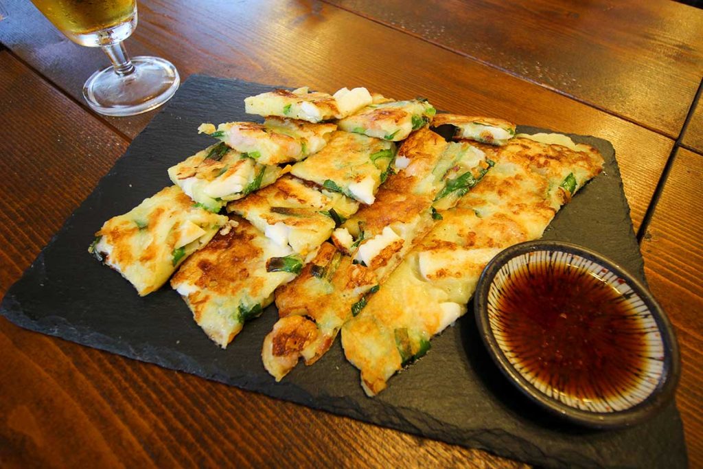 エビやイカがたっぷり入ったチヂミはタレにつけて食べるとビールと相性抜群!
