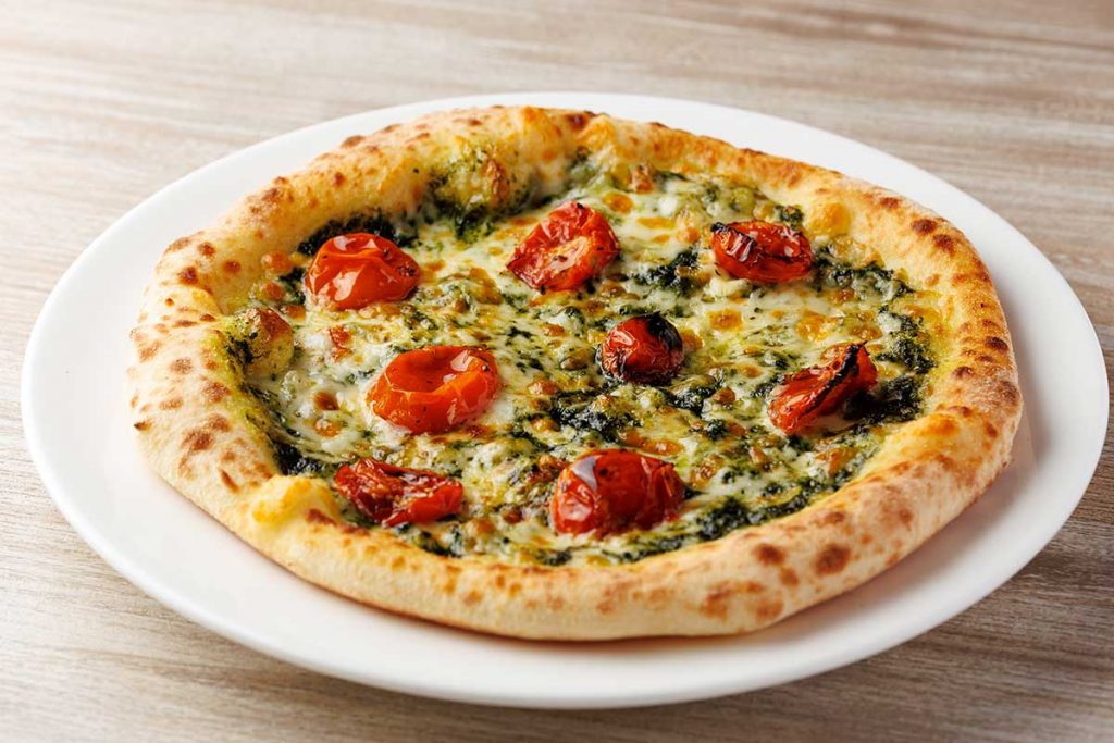 バジルの風味豊かなソースに、セミドライで旨みを凝縮させたトマトの甘酸っぱさが相性抜群!こちらもニンニクがしっかり効いていてパンチあり◎そしてやっぱり生地がおいしい~~!職人さんが焼くピッツェリアの味に引けを取らない本格ナポリピッツァです。