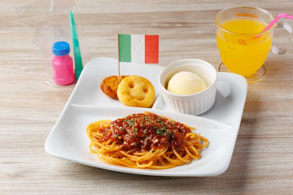 「おこさまランチ」(税抜450円)。ミートソースorナポリタン、ポテト・ナゲット、アイスクリーム、ドリンク1杯、おもちゃがセット。※小学生以下対象