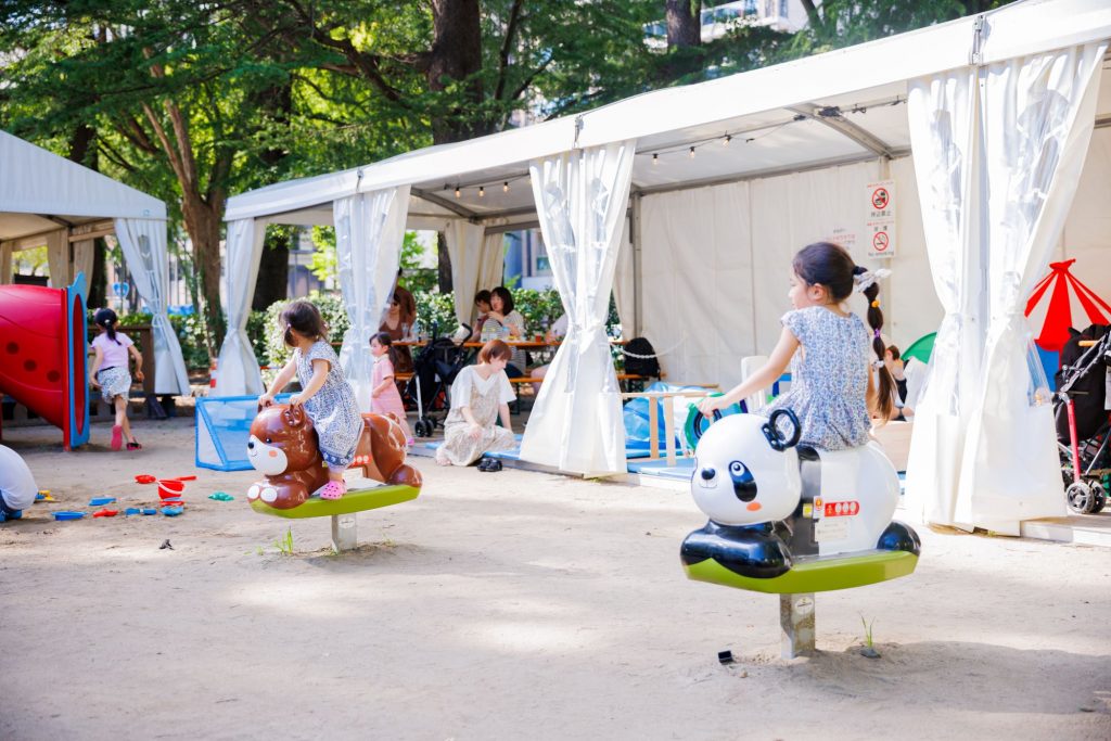 会場内にはキッズスペースも完備。テントの中にマットを敷いているので、小さなお子さんでも安心して利用できます。プレッツェルやスイーツ、ソフトドリンクなどのお子さんでも食べられるメニューの販売、さらには大道芸や週末限定ワークショップも開催しているので、家族みんなで楽しめます!