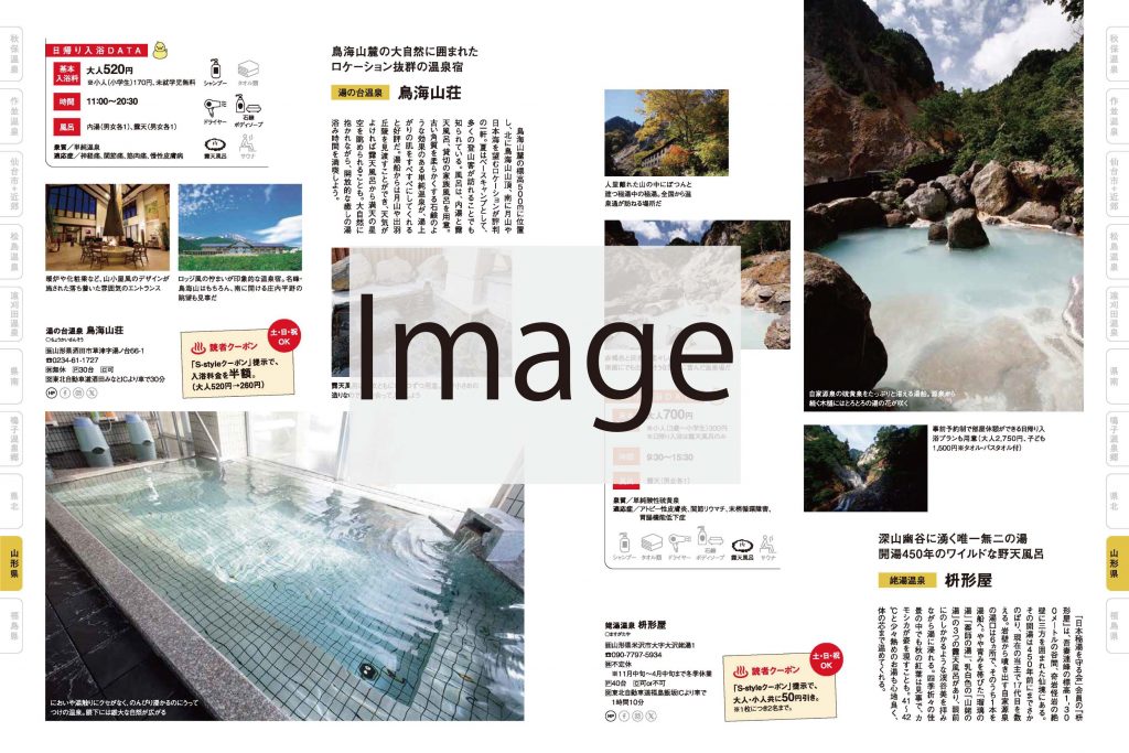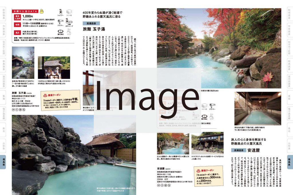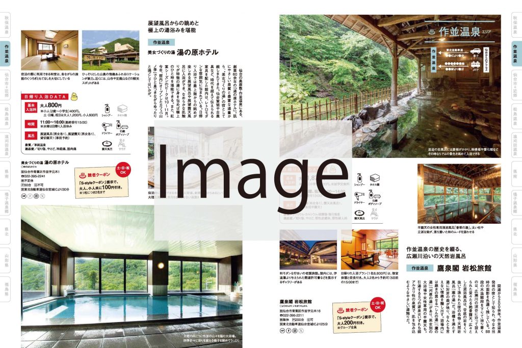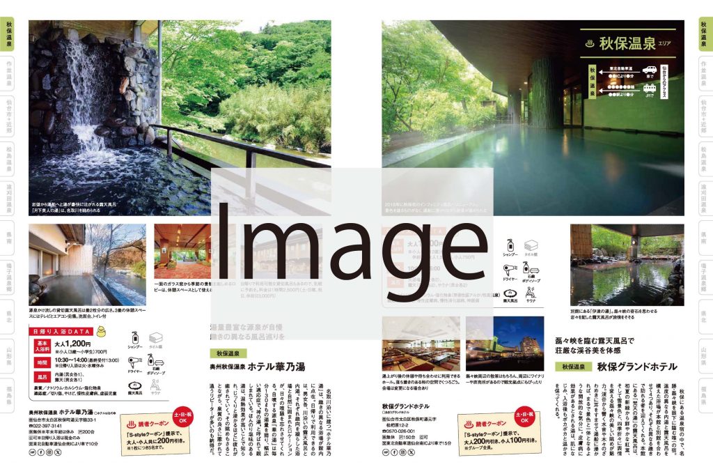 S-styleの中でも、数多くの読者の皆さんから好評の声をいただく大人気企画・秋の日帰り温泉特集。今年は宮城県内のみならず、山形、福島までエリアを拡大してお届け。コーナー内で紹介している58軒すべてで、入浴料の半額・割引クーポンを使うことができるんです!