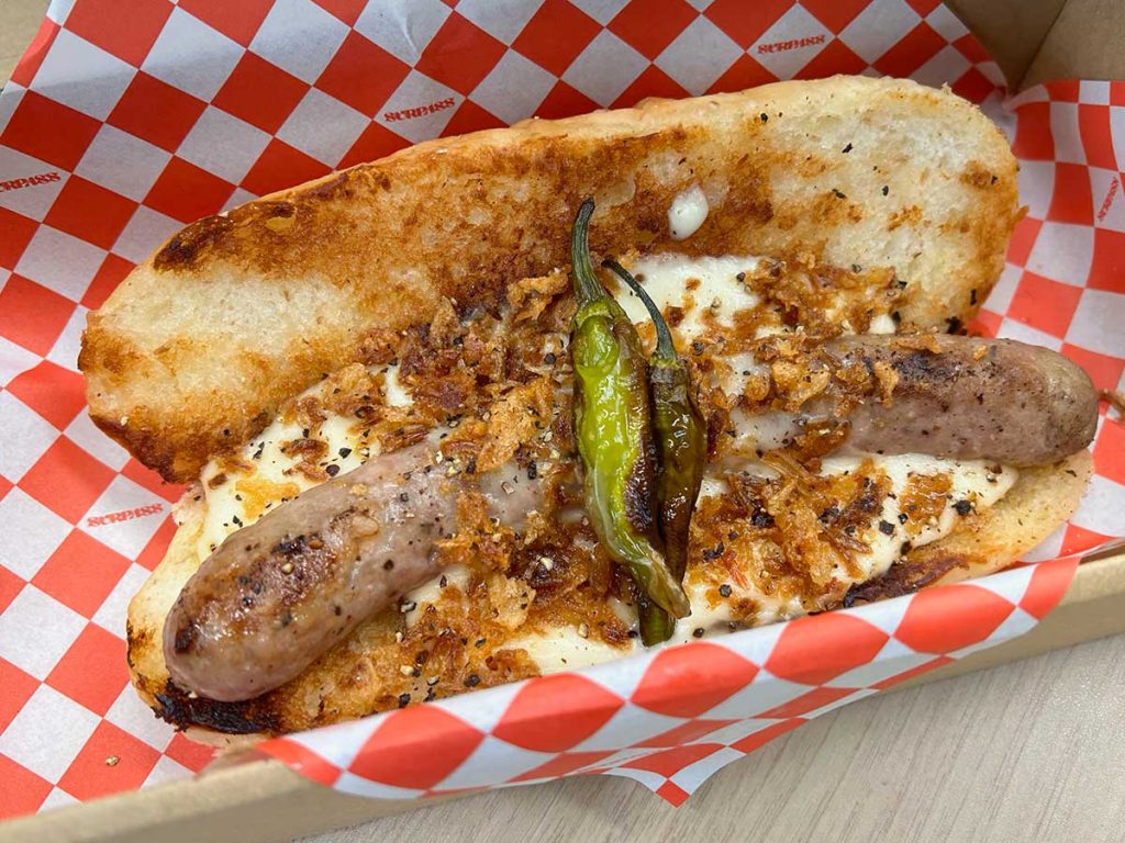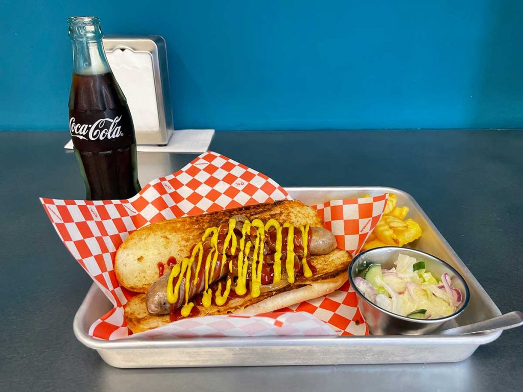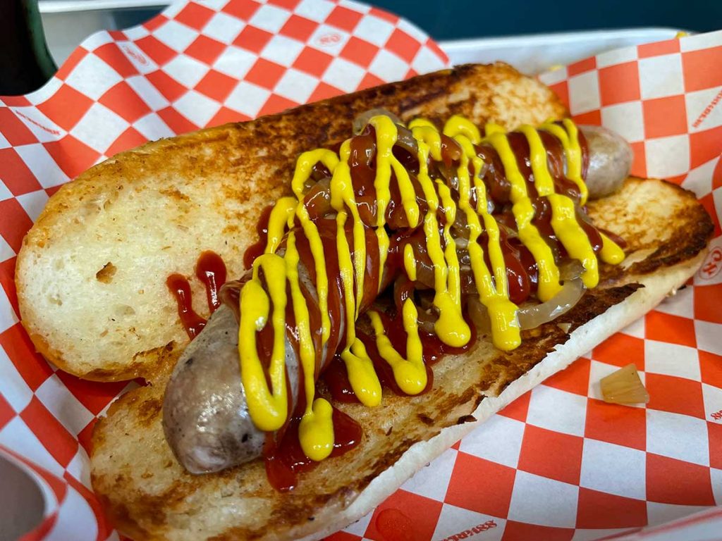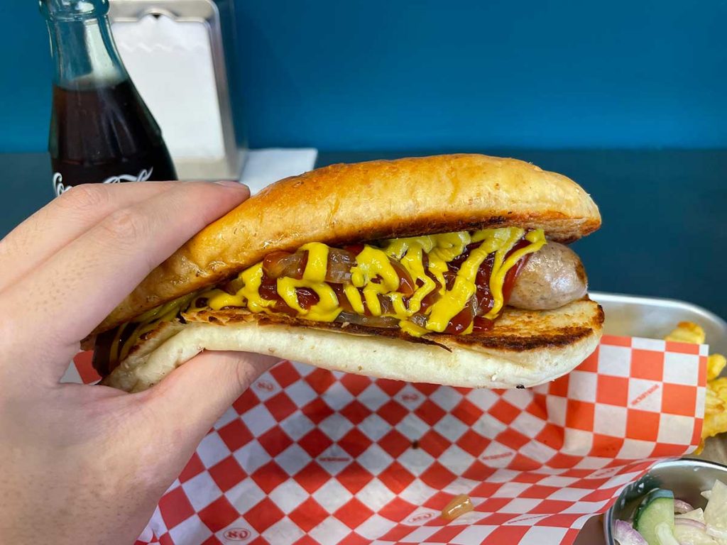 大ぶりのソーセージと、たっぷりかかったケチャップ&マスタード、そして香ばしく焼き目を付けたバンスが見るからにおいしそう!