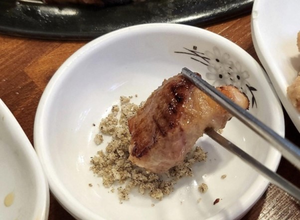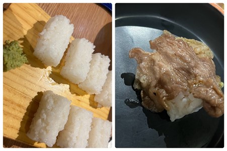 シャリの上にワサビを乗せて….焼いたお肉を乗せて食べるのがオススメ♡