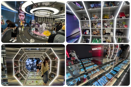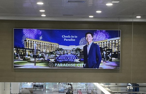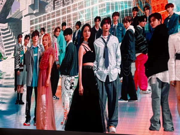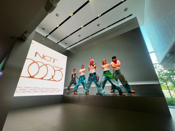 受付正面には大きなスクリーンに囲まれたスペースがあり、そこでは所属アーティストのMVなどが流れています。推しのグループの巨大スクリーンの映像の前で写真を撮るのが人気です。