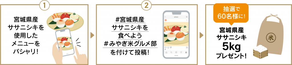②「#宮城県産ササニシキを食べよう」「#みやぎ米グルメ部」をつけてInstagramに写真を投稿するだけ!
