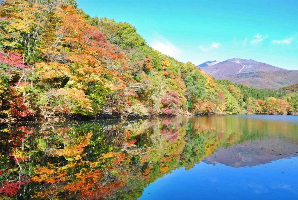 湖面に映る青空と白い雲、そして赤や黄色に染まった紅葉のコントラストが美しい!