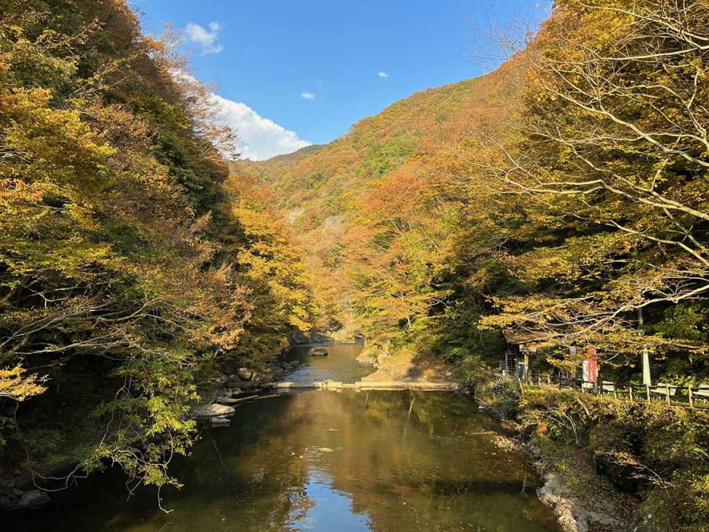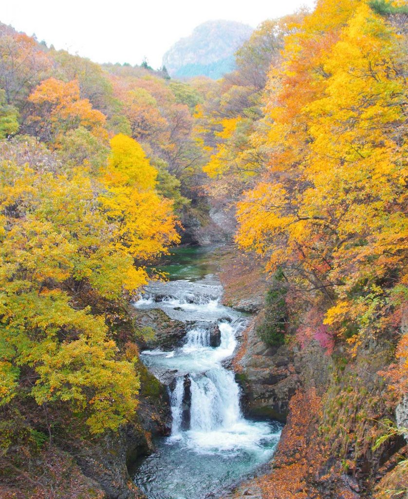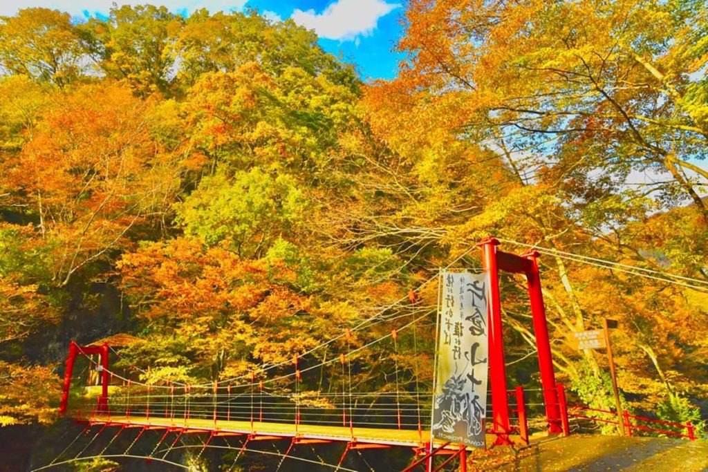白石川上流の小原温泉郷の周辺は、国道に沿うように深いV字の渓谷が続いています。渓流に紅葉が映り込んだ鮮やかな景観は、秋の深まりを感じさせてくれますよ。駐車場から川沿いの小道を歩くと見えてくる赤い吊り橋も要チェック!吊り橋からは碧色の白石川に映る紅葉が撮影できますよ。日帰り温泉『岩風呂 かつらの湯』に立ち寄るのもおすすめです。