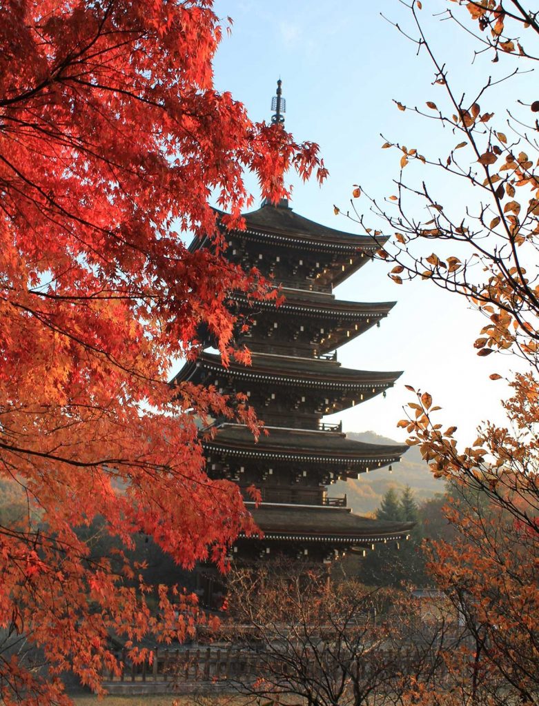 通称“定義さん”として親しまれる定義地域は、周囲を広葉樹に囲まれた紅葉の名所。中でも、『定義如来 西方寺』内にある五重塔庭園のモミジは必見。庭園内にはお茶室があり、赤く色づいた風景と五重塔を眺めながら、抹茶をいただくこともできます。門前では、定番の「定義三角あぶらあげ」のほか、「味噌おにぎり」や「串おでん」などのグルメも大人気!
