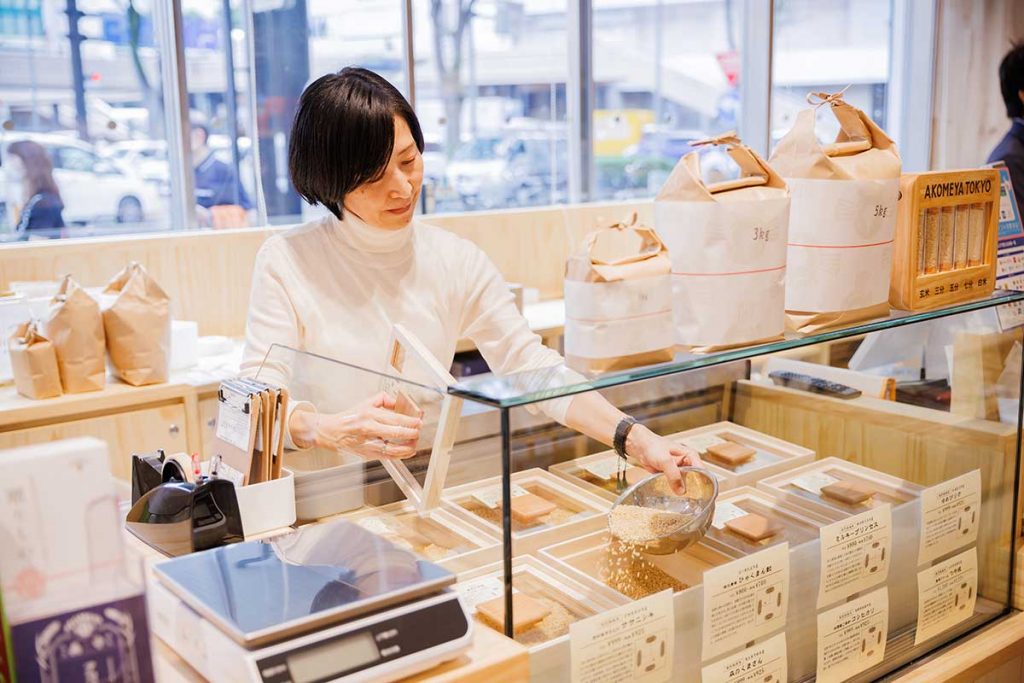 好みのお米を自由に選び、その場で精米してもらえる量り売りコーナーも。随時8種類の米が並び、玄米、三分づき、五分づき、七分づき、白米から精米方法も自分で選べます
