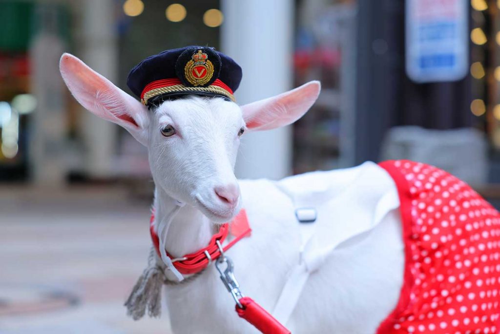 三陸鉄道の駅長も務めたことがあるヤギ店長が、駅長帽を被ってお出迎え