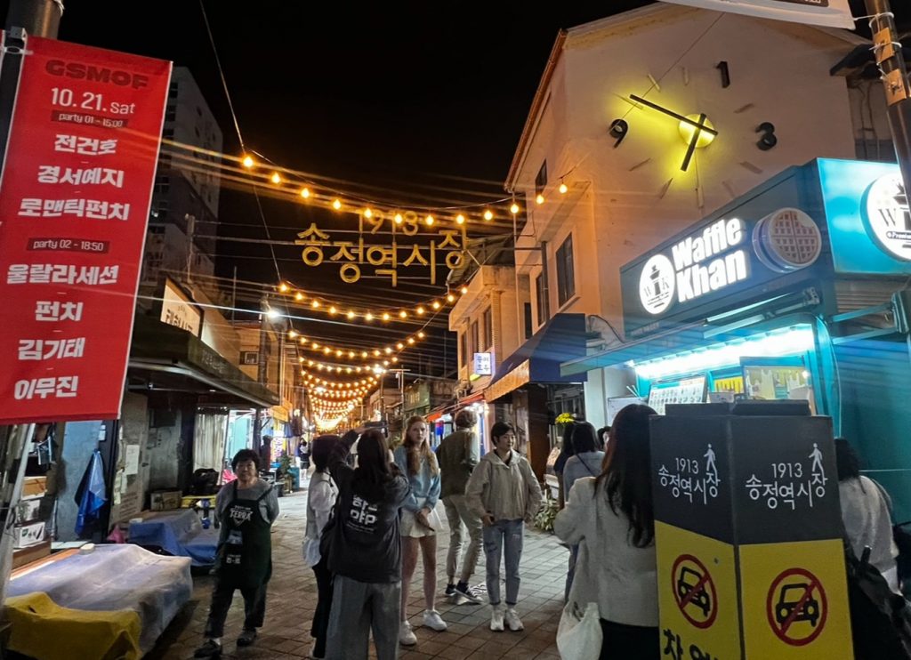 伝統市場なだけにレトロな雰囲気が漂っていて懐かしい雰囲気です。老舗の店舗だけではなく新しいお店も増え、古さと新しさが共存する雰囲気のある通りでは、パンやホットク、串焼き、コロッケなどの美味しい食べ物やお土産に選びが楽しくなるような雑貨屋、カフェなどが連なり、夜になるとライトアップされてより一層素敵な雰囲気となります。入口のシンボル前は写真スポットとして人気です。