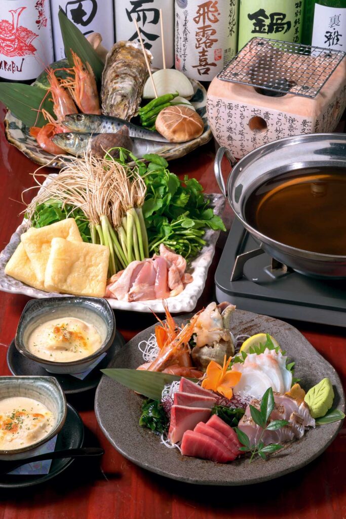 仙台名物「せり鍋」や三陸産魚介のお造りなど、宮城のうまいものを集めた、贅沢な全9品のコース