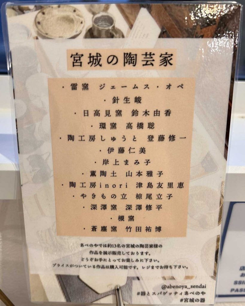 店内では宮城県内13人の作家による器も販売しており、『陶工房しゅうと』『雷窯(いかずちがま)』などの人気作家ほか、注目の若手、針生 峻さんの作品など、ほかではなかなかお目にかかれないアイテムも。