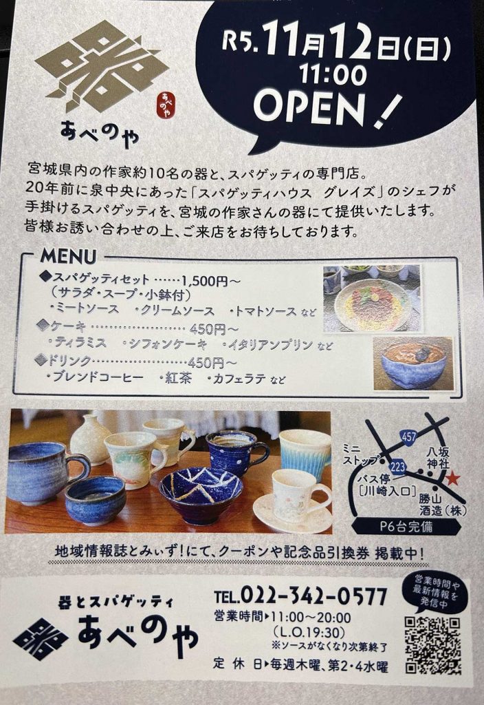 こんにちは、S-style編集部のあちきです。2023年11月12日、泉区朴沢に『器とスパゲッティ あべのや』がオープン。早速行ってきましたのでご紹介します。