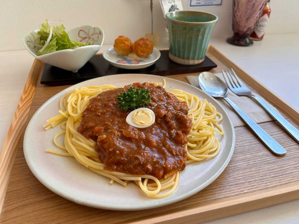 「特製ミートソーススパゲッティ」(サラダ、小鉢、スープ付1,580円)。付け合わせのサラダやコロッケ、スープも手作りでとってもおいしい!