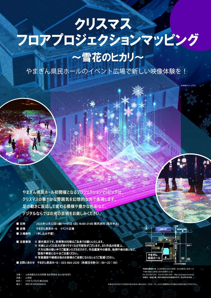 山形県山形市にある『やまぎん県民ホール』のイベント広場にて、12月22日(金)~24日(日)の3日間限定で「クリスマス フロアプロジェクションマッピング ~雪花のヒカリ~」が開催されます。