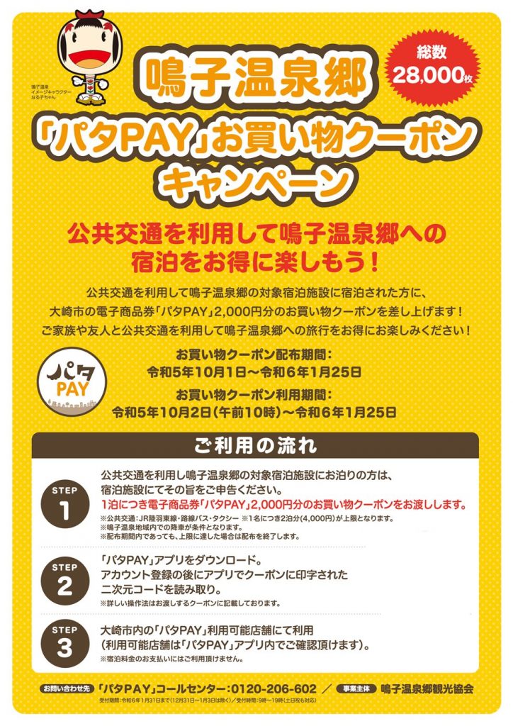公共交通を利用して、対象の宿泊施設に宿泊した人に、大崎市の電子商品券「パタPAY」2,000円分のお買い物クーポンをプレゼント!