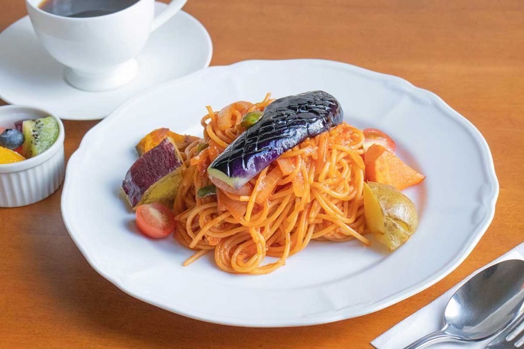 「味噌と塩麹の芳醇ナポリタン」(単品770円、セット1,100円)※ミニデザート、コーヒーor紅茶(ホット/アイス)付。ヴィーガン・ベジタリアン・ハラルの方向け。にんにくとタマネギを使用