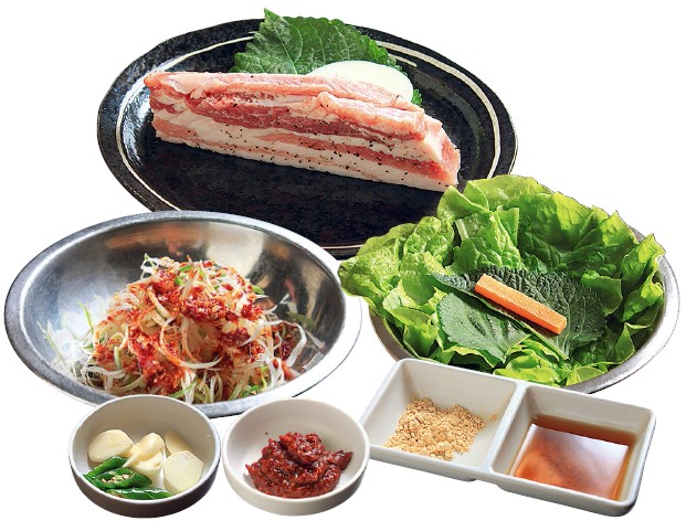 サムギョプサルの鉄則は、ひと口で頰張ること。肉とタレの旨み、そして薬味の香りが“三味一体”になるおいしさを楽しめる