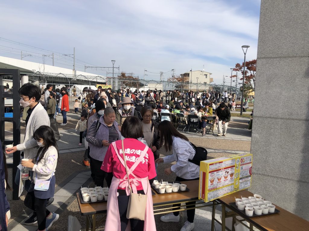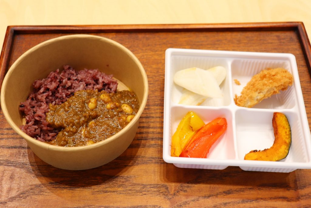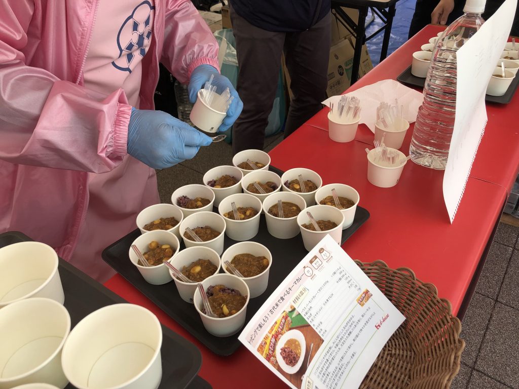 紫色の古代米に、白い大豆・ミヤギシロメがアクセントになった「古代米で食べるキーマカレー」は、“トッピングで楽しもう”をテーマに、宮城県産のパプリカやカボチャなど彩り豊かな具材とともに楽しめる内容に。このカレーは、2023年11月に開催された「たがじょう秋まつり」でもふるまわれ、来場者から多くの反響が寄せられました。