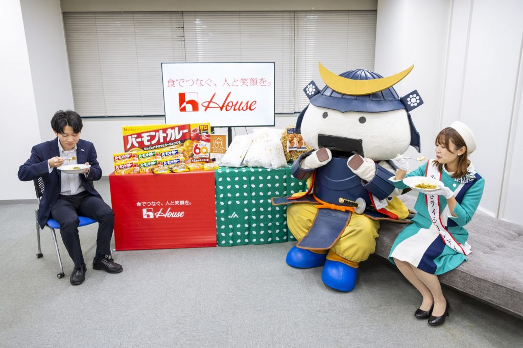 「とれたて仙台」とコラボした「時短あおばひき肉カレー」を、むすび丸とみやぎライシーレディとともに実食