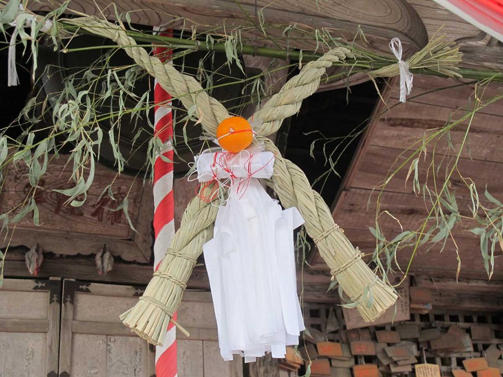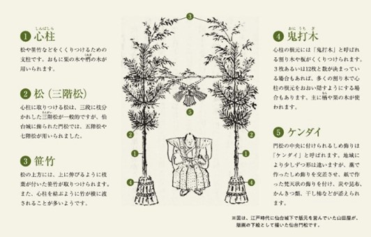 旧仙台藩で飾られていた「門松」=「仙台門松」は、2本の心柱に大きな松と笹竹を取り付けて門のように造り上げ、注連縄を巻き付けた形。中央に「ケンダイ」と呼ばれるしめ飾りを取り付け、鬼打木(おにうちぎ)というクリの割り木を根元に添えるものでした。