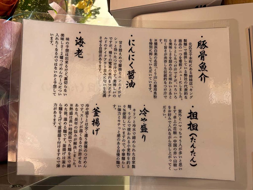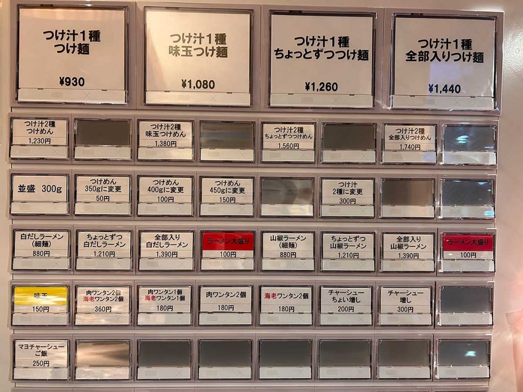 左上がスタンダードなつけ汁1種。二段目がつけ汁2種。ほか『水原製麺』のラーメンもラインナップしています