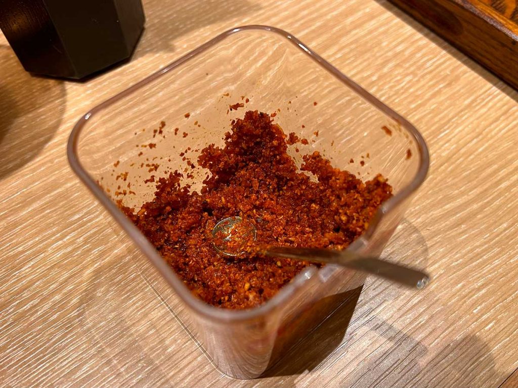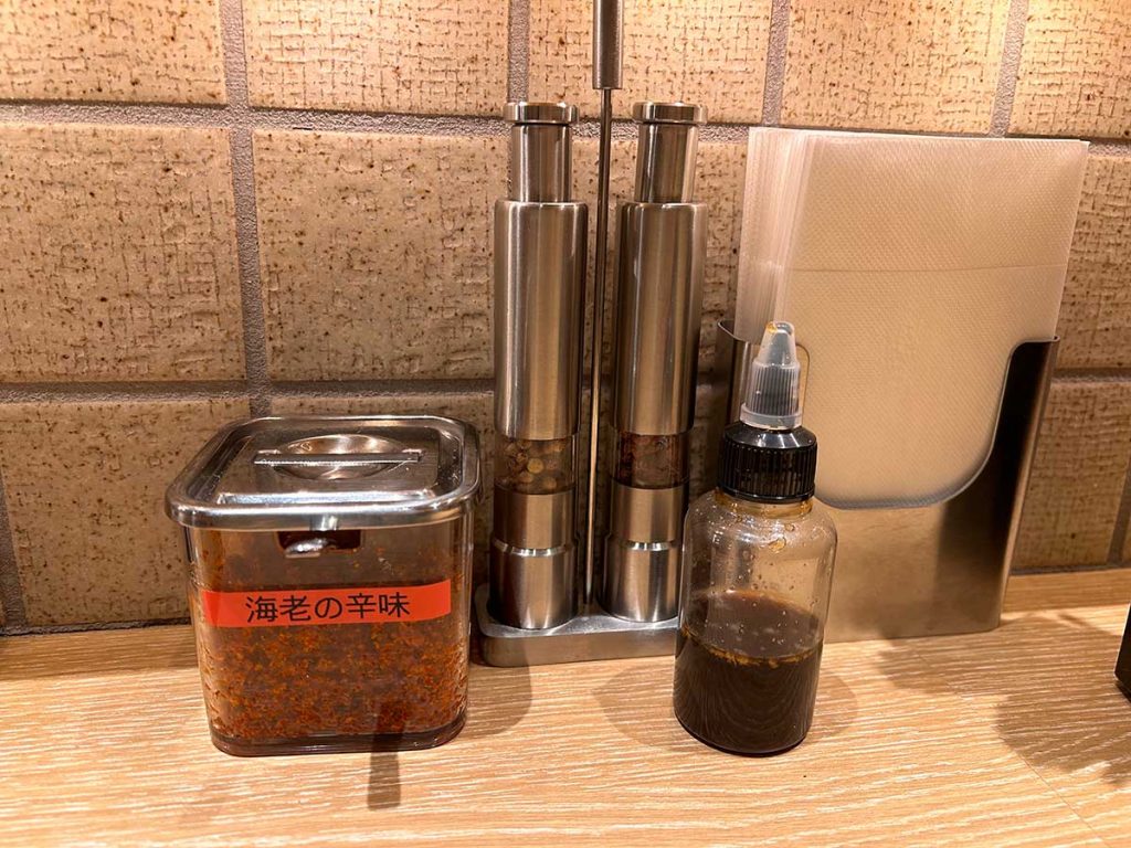 ミルで挽き立てを楽しめるホワイトペッパー、花椒のほか、自家製の海老辛味や、スープが薄くなった時用の専用かえし、割りスープも用意されています。