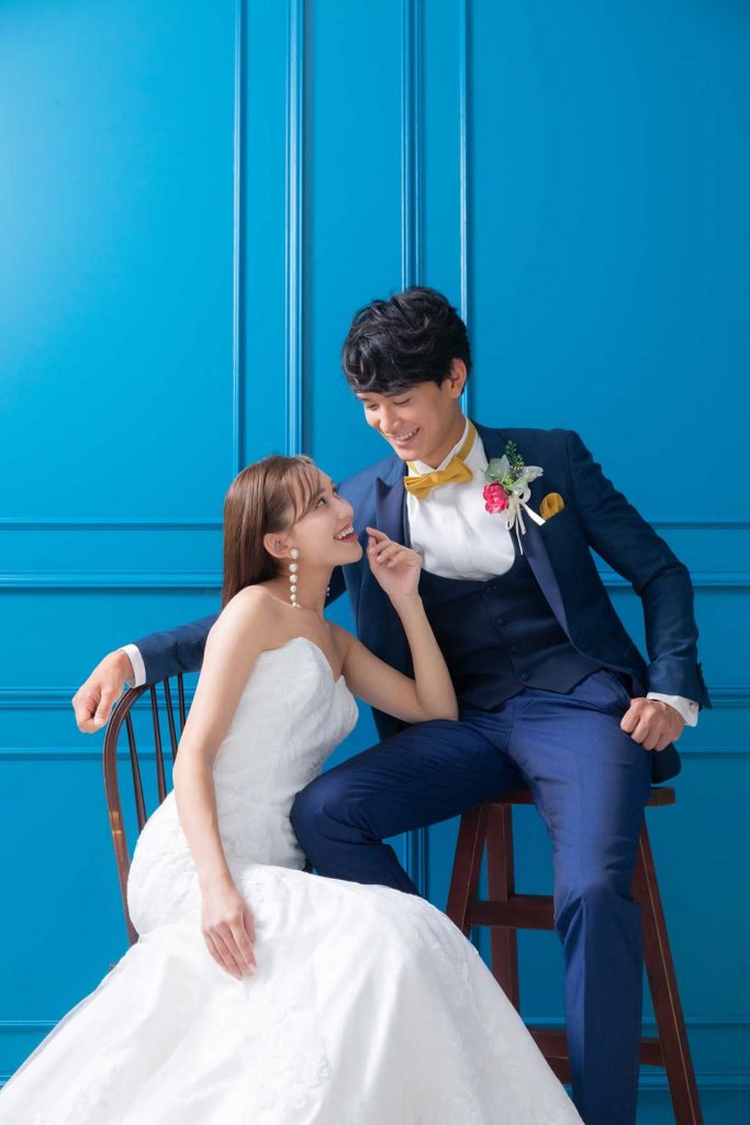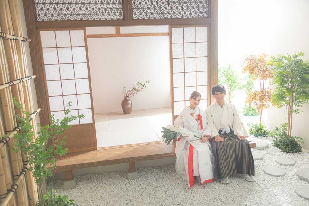 多くのカップルの撮影をプロデュースしてきた実績豊富で、天候や気温に左右されず撮影ができるのが魅力。本格的な和室セットでの和装撮影からカラーバックや白背景まで、幅広いテイストに対応しています。