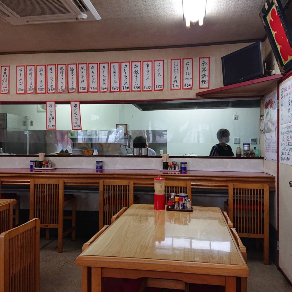 店内は昭和の食堂風情そのまま。朱色の合板カウンターの上にはずらりと品書きが張り出されています。かつて「急行まつしま」の食堂車両で腕を振るったお父さんのこだわりで、厨房も店内も常に油汚れがなくピカピカ。隅々まで手入れが行き届いています。