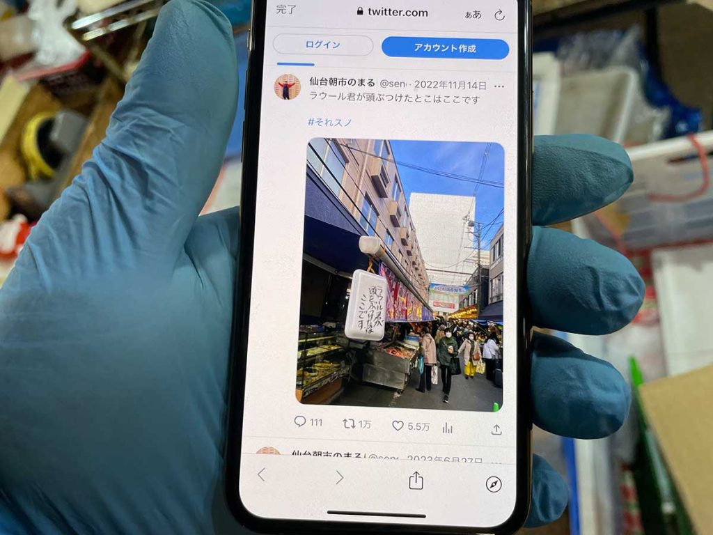 2022年11月13日放送のTBS「それSnow Manにやらせて下さい」の仙台ロケ中、身長190㎝台という高身長メンバーのラウールさんが頭をぶつけた場所に目印を設置し、Twitter(現X)で話題を呼んだ仙台朝市の商店『佐藤敬商店(まるけい)』。