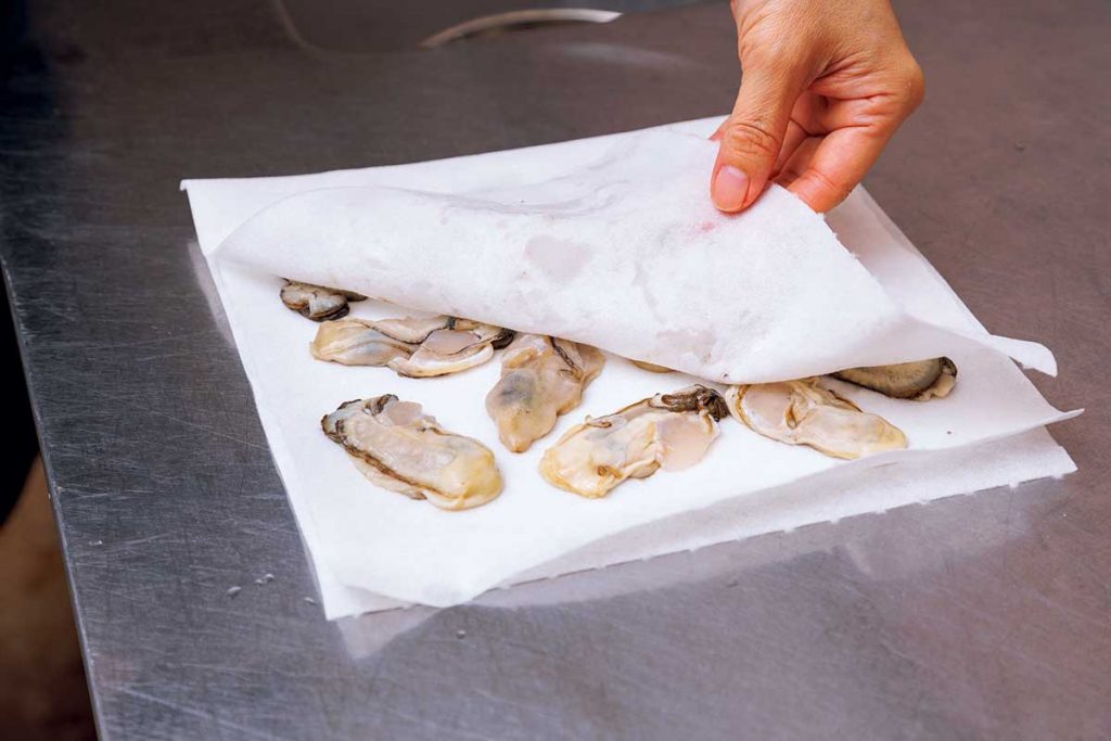 <下ごしらえ>牡蠣はきれいに洗い、キッチンペーパー等で丁寧に水気を拭き取り(※1)、片栗粉をまぶしたら余分な粉は落とす。長ねぎは約3cm幅に切る。