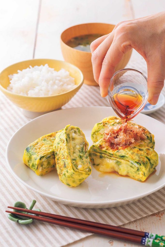 ❷同じ工程を2回繰り返し、食べやすい大きさに切って器に盛り、かつお節をのせポン酢をかけたらでき上がり。