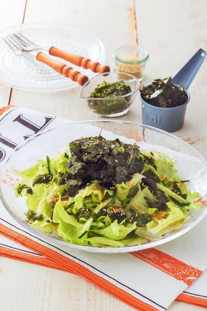 ❸②を器に盛りつけ、手もみにしてほぐした海苔といりごまをのせたらでき上がり。