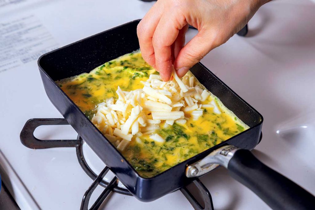 ❶玉子焼き器に油を薄くひき、下ごしらえしたたまご液の1/3を流し入れ、半熟になったらチーズを中央にのせ(※1)、手前側に向かって巻き、向こう側へ寄せる。