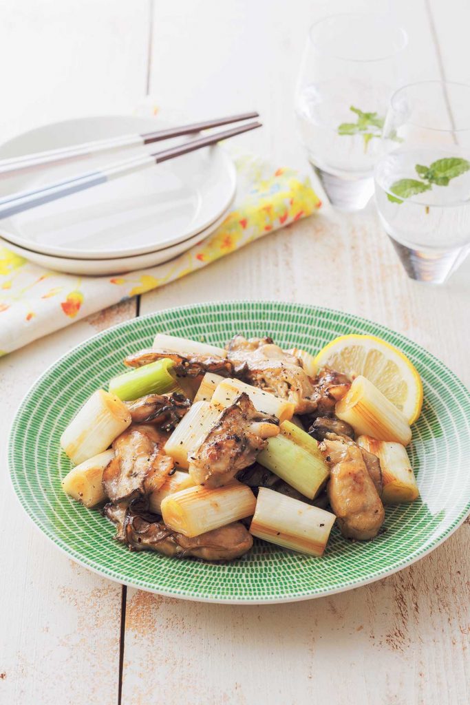 ❷①のフライパンに長ねぎをいれ、牡蠣のエキスを吸うように転がしながらじっくり火を通す。