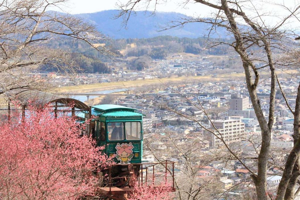 名物のスロープカーで船岡平和観音が立つ山頂へ。4月上旬には桜も見頃を迎えます