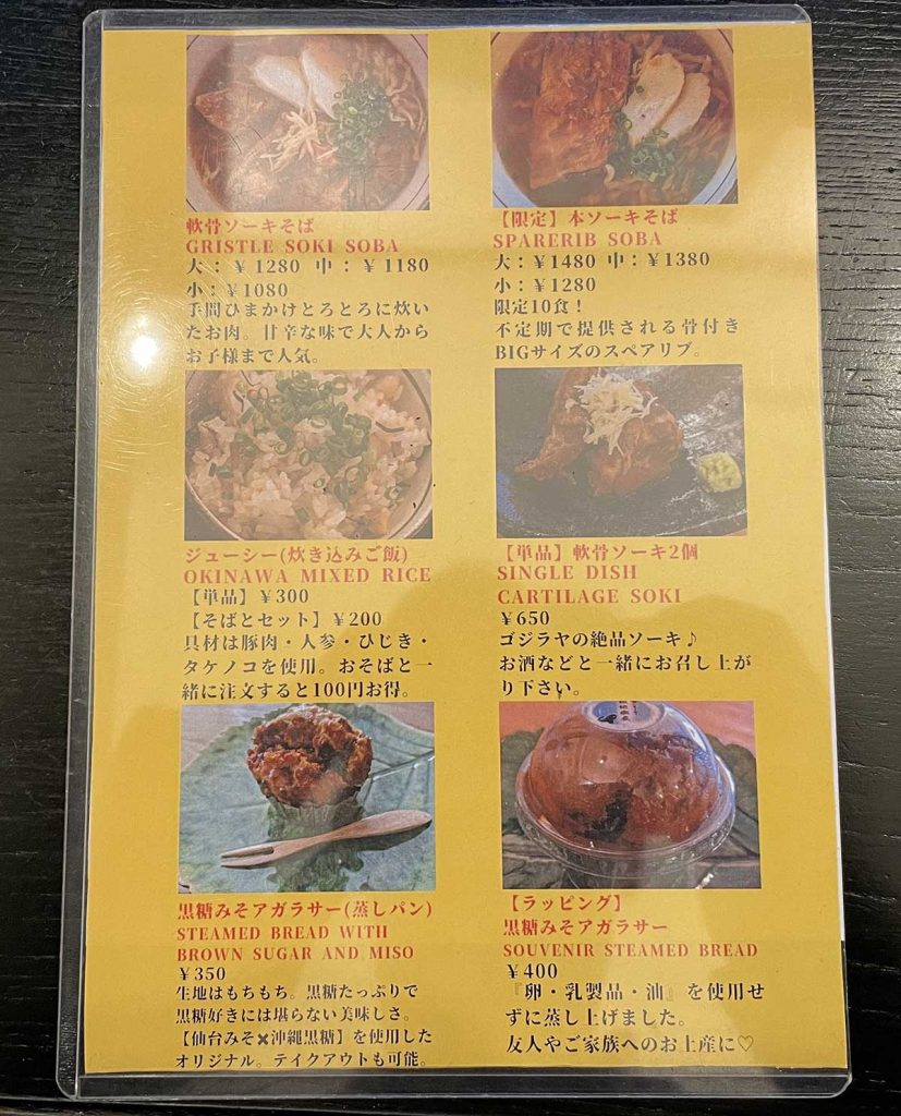 フードメニュー表。「軟骨ソーキそば」「本ソーキそば(数量限定)」を中心に、沖縄の炊き込みご飯「ジューシー」や自家製の蒸しパン「黒糖みそアガラサー」などをラインナップ