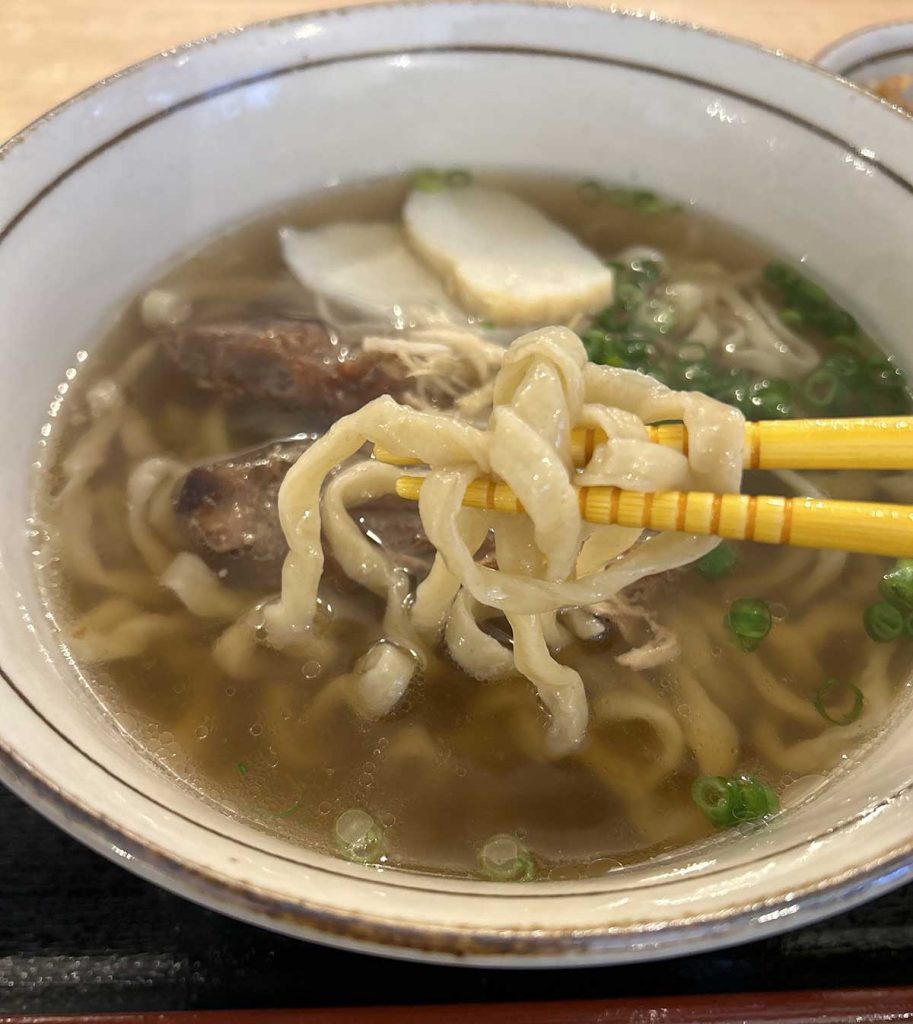小麦粉と塩、そしてガジュマルやデイゴなどの樹木を燃やしてできた“木灰”を水に入れてできた上澄み(灰汁)を使って作る木灰そばが店のこだわり。ちぢれ麺にそばつゆがよく絡みます