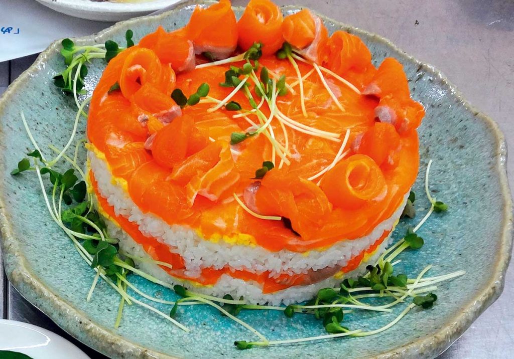 旬の海の幸を使って、家庭で手軽にできる料理を学びます。今回のメニューは「めぐみ野」銀さけを使用したケーキ寿司です。講師は食育NPO「おむすび」&(株)仙台水産。