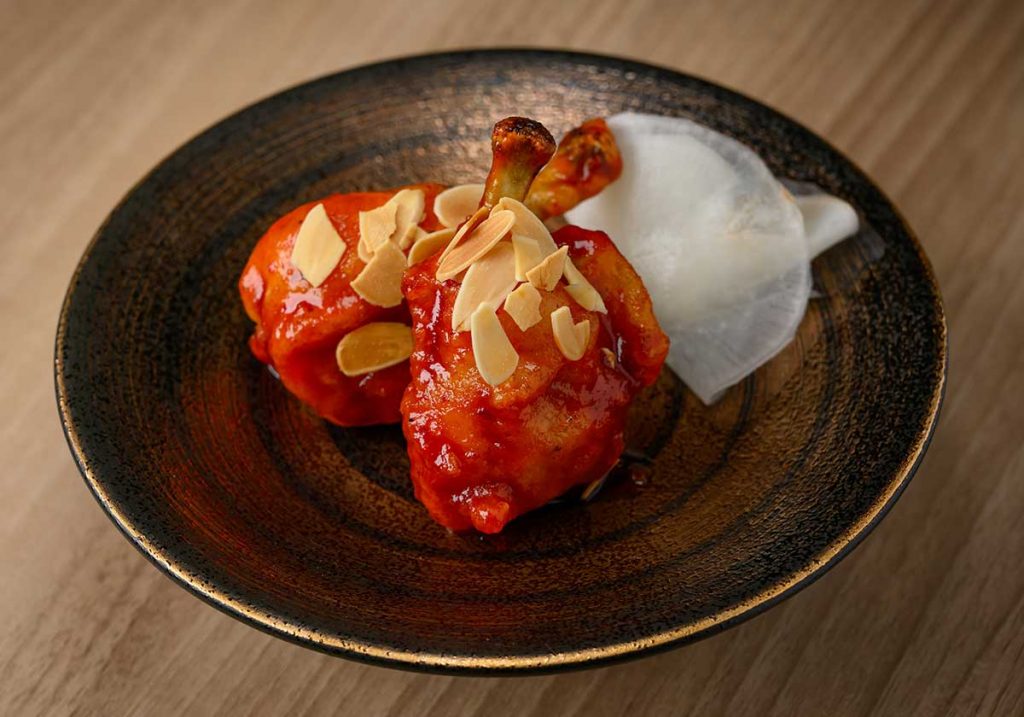 キンパやチャンジャなど、韓国料理も充実しているのが『トラコ』の特徴。中でも「骨付き!ヤンニョムチキン」はピリ辛さがクセになるひと品。ヤンニョムをたっぷり絡めた手羽先は食べやすいサイズ感で、外はカリッと、中はジューシーで柔らかい食感に仕上げています。