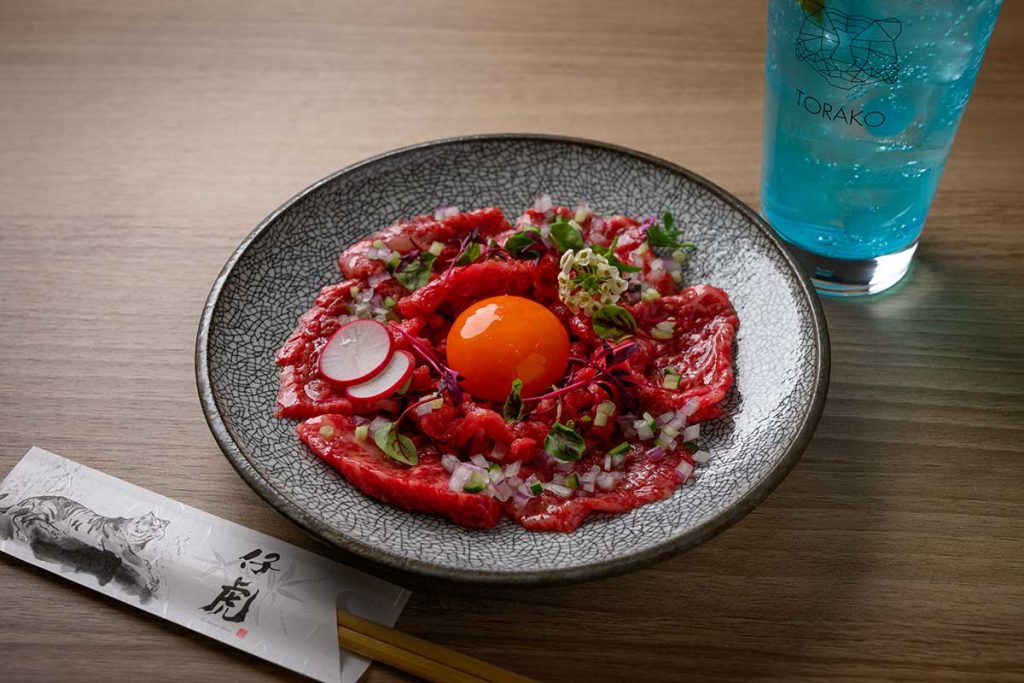 まずいただいたのは、牛刺しとユッケを一度に楽しめる「トラコ刺し」。