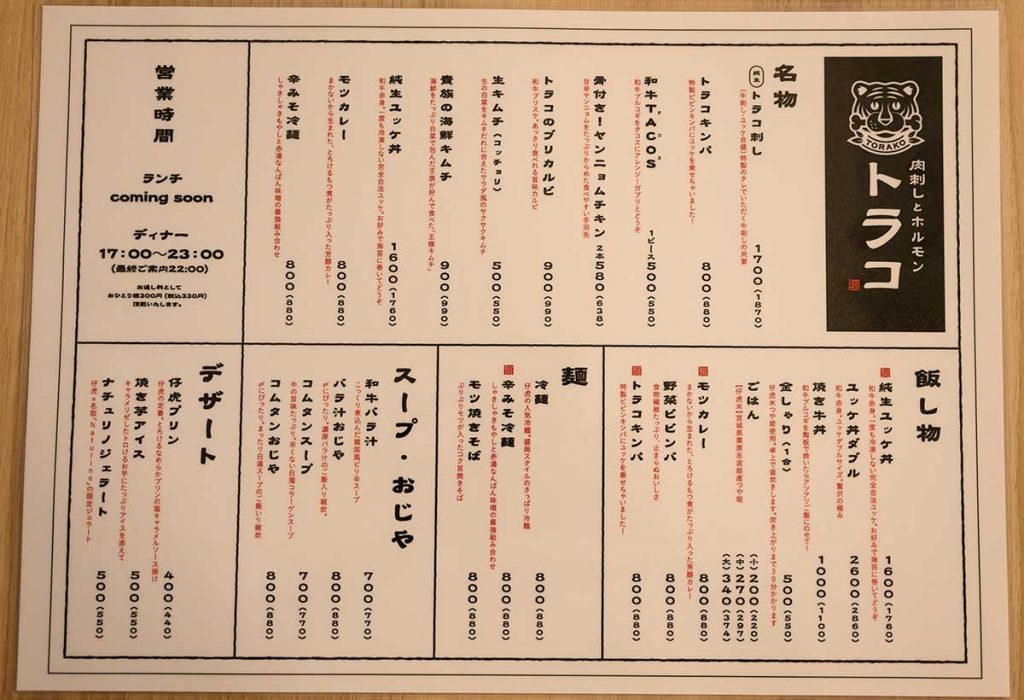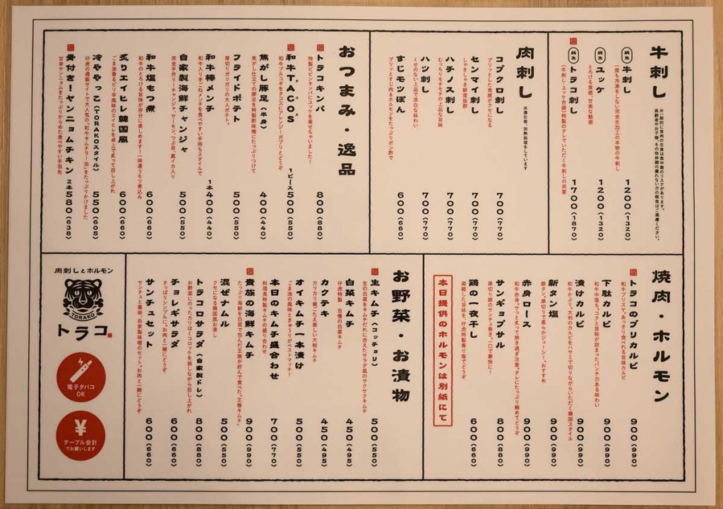 名物は、牛刺しとユッケの合盛「トラコ刺し」(1,870円)や、その日によって内容が変わる「本日のホルモン盛り」(1,400円)などの肉刺し&ホルモンメニュー。