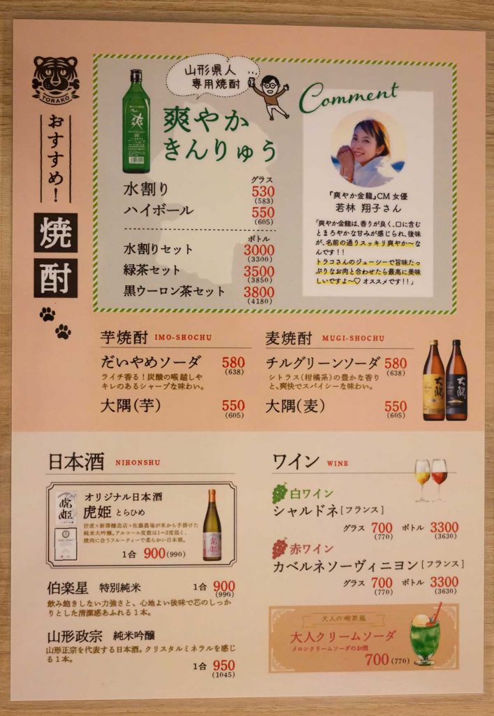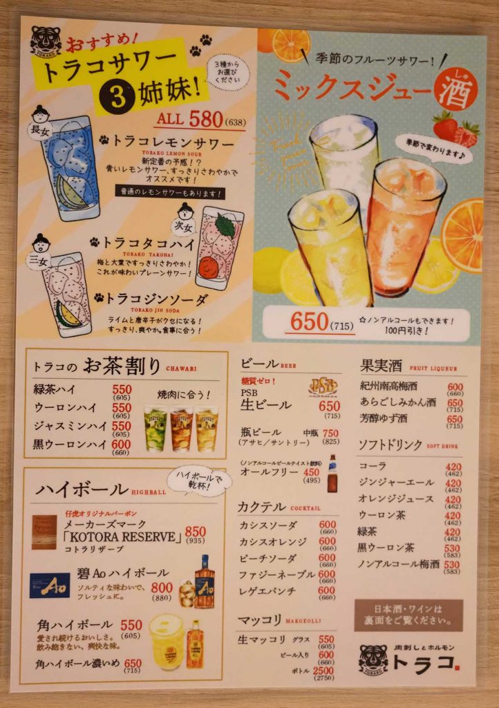 “トラコサワー姉妹”や、季節のフルーツサワー「ミックスジュ―酒」(715円)、フルーティで口当たりが柔らかい日本酒「虎姫」(1合990円)など、店オリジナルのお酒も用意