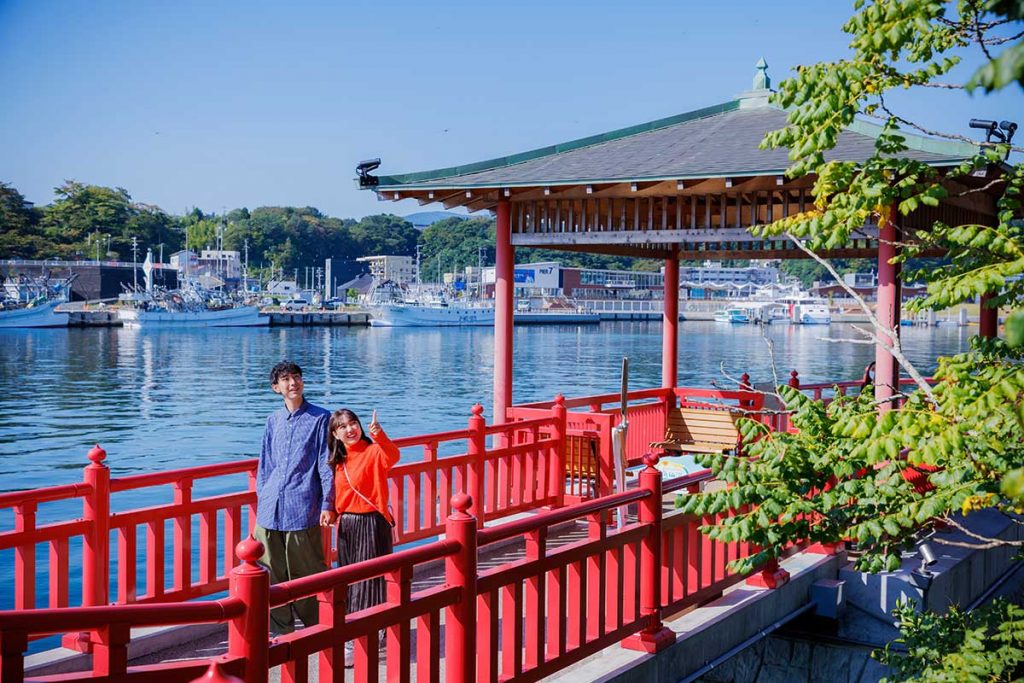 赤い遊歩道が特徴的な『浮身堂』。のんびりと散歩しながら、停泊中の漁船が並ぶ気仙沼ならではの風景を楽しもう!